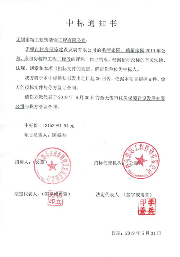 公司中标毛湾、瑞星家园2019年公租、廉租房装饰工程二标段