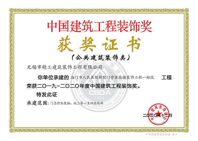 我公司承建的海门市人民医院新院门诊医技楼装饰工程一标段工程荣获中国建筑工程装饰奖。