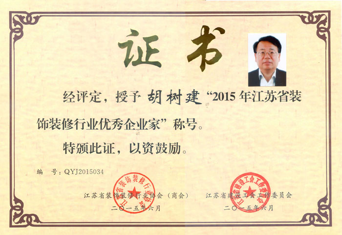 我公司总经理胡树建获得2015年度省装协优秀企业家称号